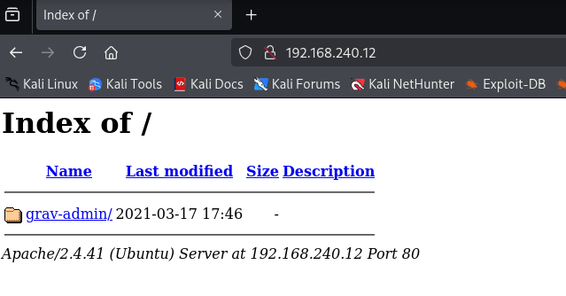 Let’s move ahead and check the IP in the web browser and I found apache version which was found in the nmap output also and I also saw directory browsing is enabled and some directory with name grav-admin is available:
