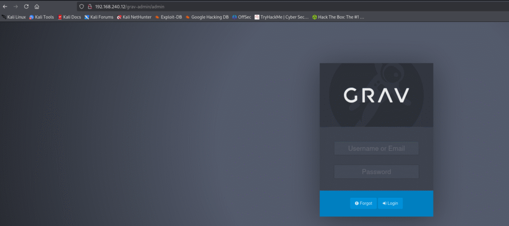 Then inside the grav-admin I tried looking for admin page and I was presented with the login panel where it was asking for username or email and password and none of the default cred worked:
