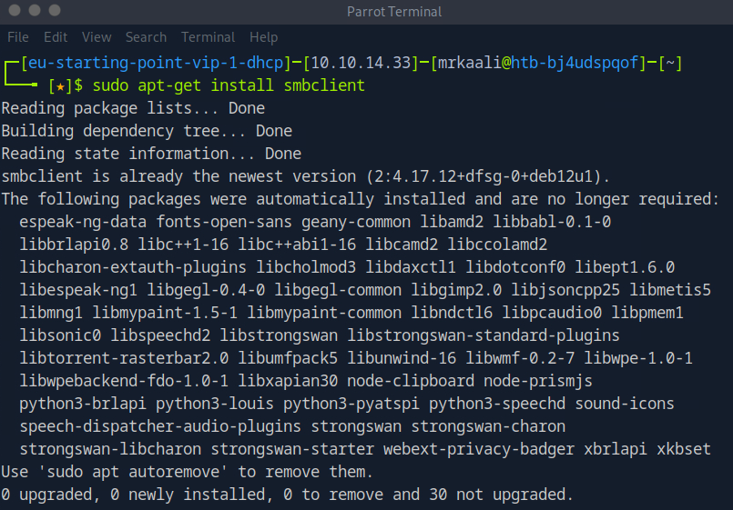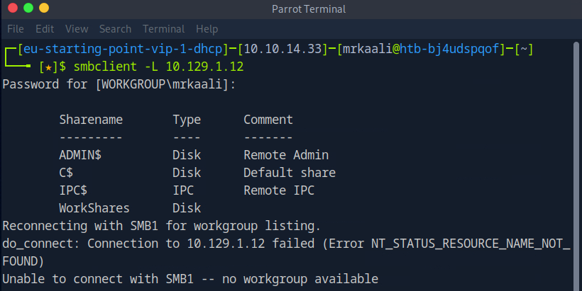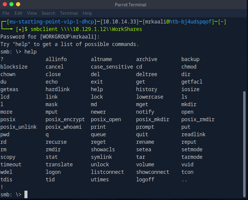Command: smbclient -L Target_IP, this command is used to list the available shared resources (shares) on a remote SMB server.