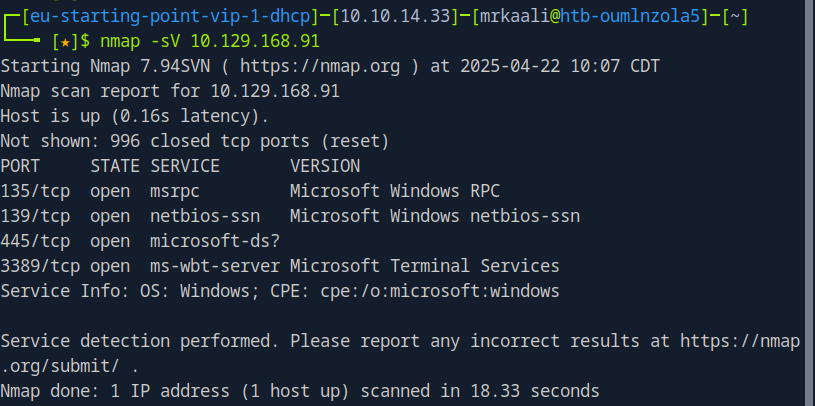 The above output shows that Port 135,139,445 and 3389 are open, and also we found that the target OS is Windows OS.