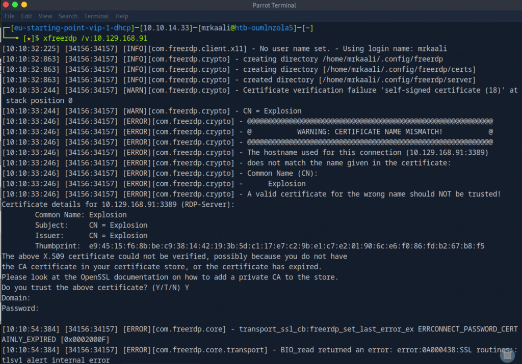 The above command is used to connect to a remote desktop service (RDP) using xfreerdp, specifying the target IP, ignoring certificate warnings, and logging in as the Administrator user.