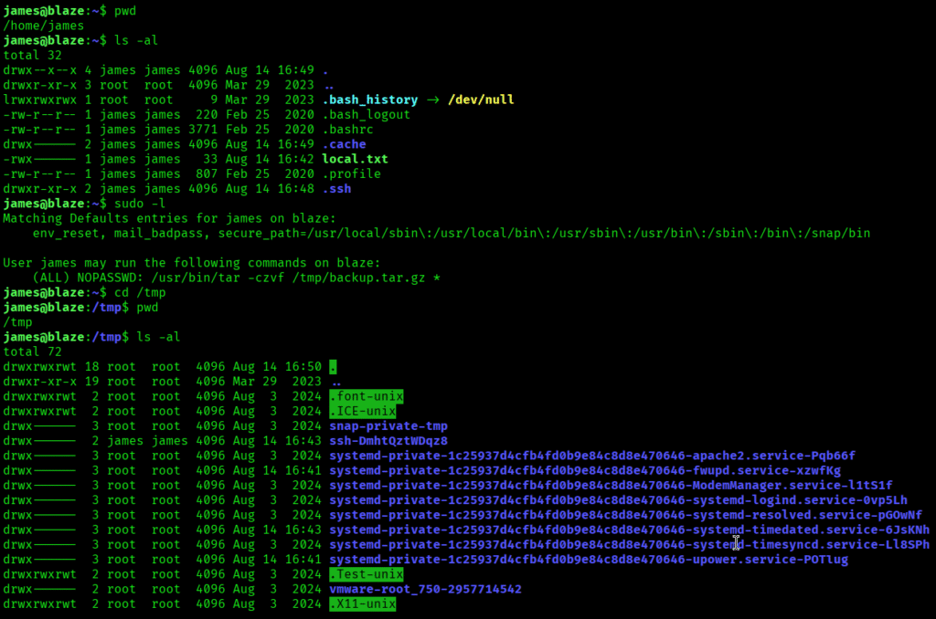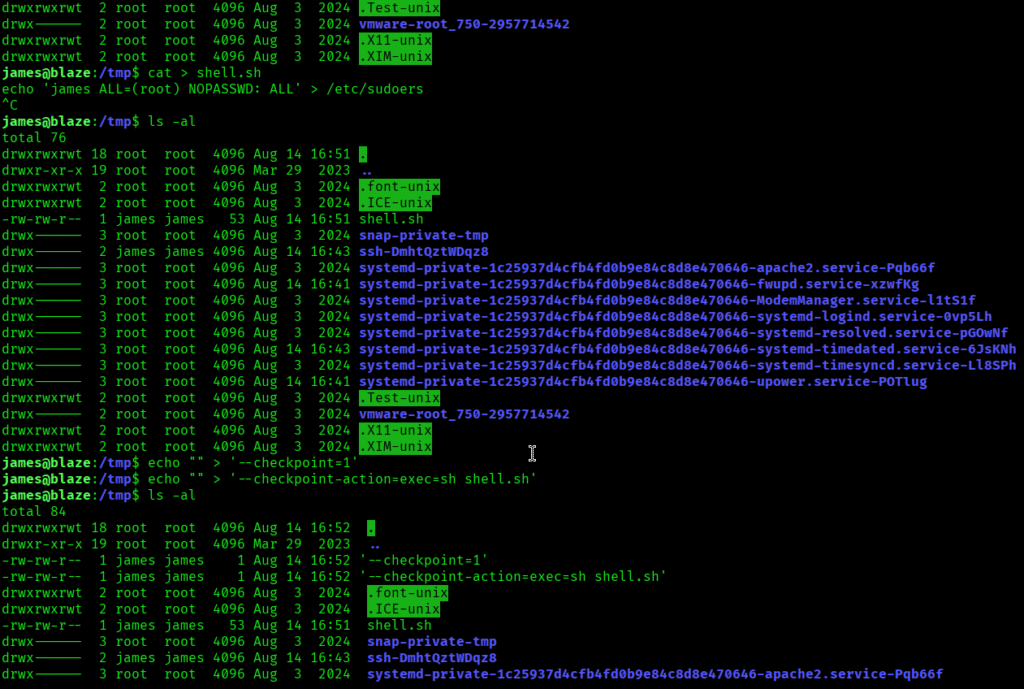 I created a file with name shell.sh consisting below payload to to grant the user James full sudo privileges without requiring a password.: