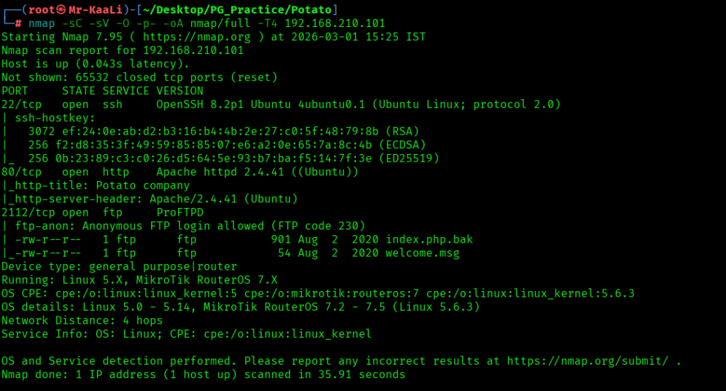 nmap -sC -sV -O -p- -oA nmap/full 192.168.210.101 -T4