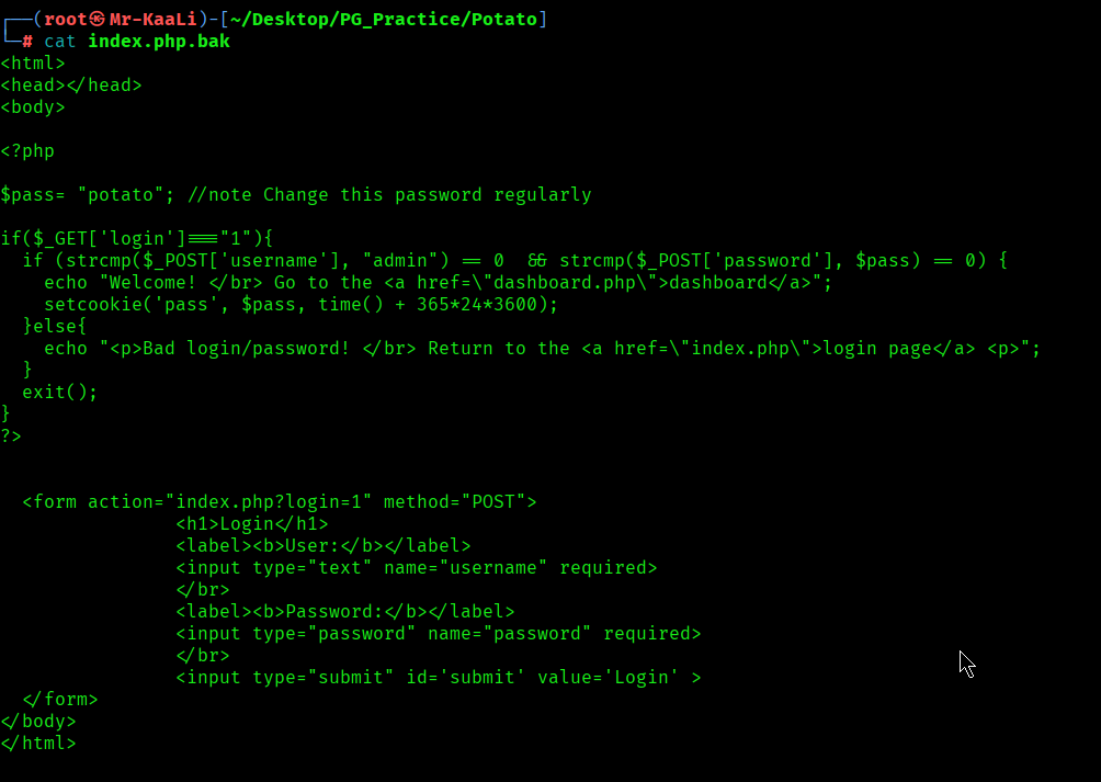 I discovered the index.php.bak file and welcome.msg file and in .bak file I found username and password: