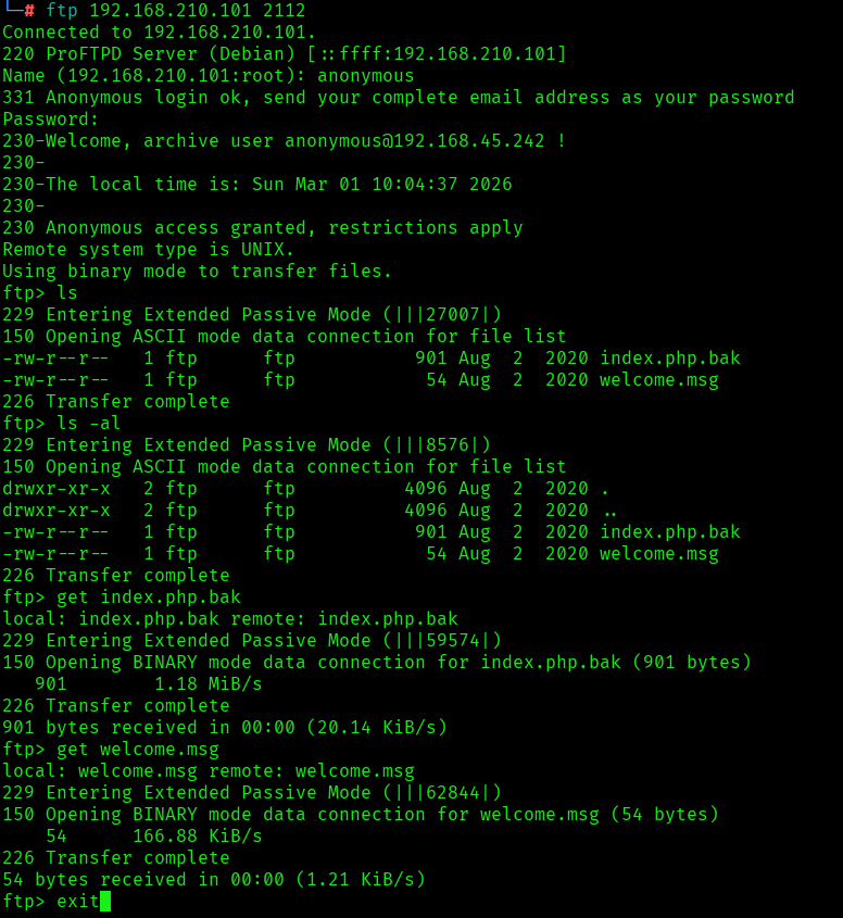 - 2112/tcp – FTP Service running ProFTPD & Anonymous login was allowed.