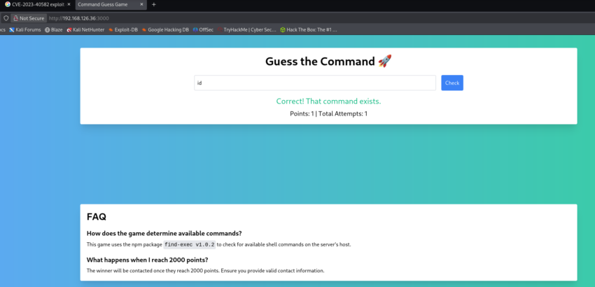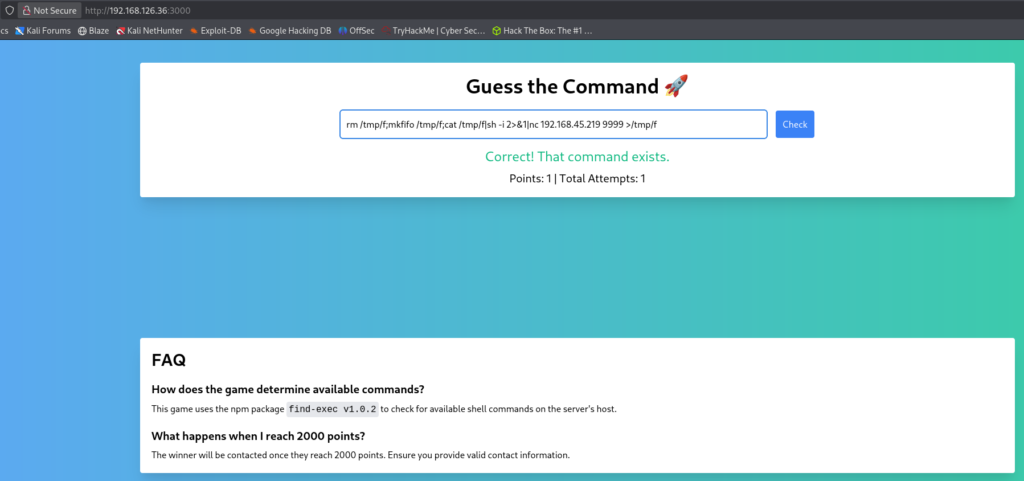Then I went ahead and checked the IP in the web browser with port 3000 and I found a page running says guess the command: