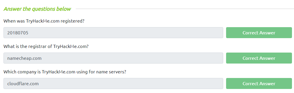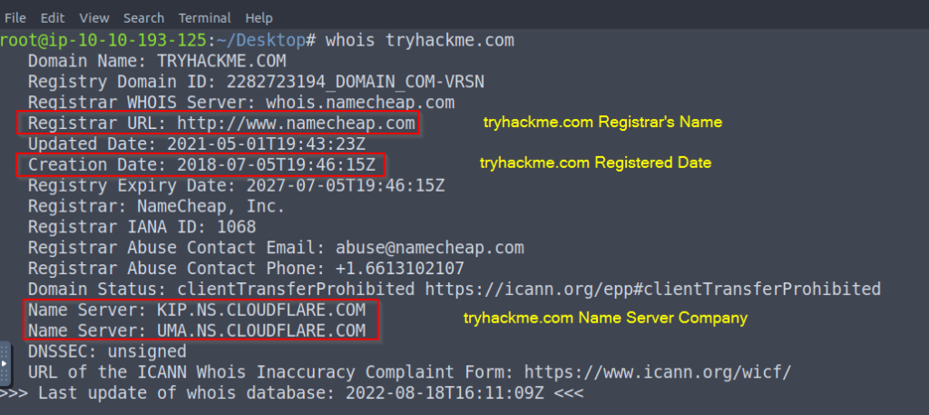 On the AttackBox, open the terminal and run the whois tryhackme.com command to get the information you need to answer the following questions.