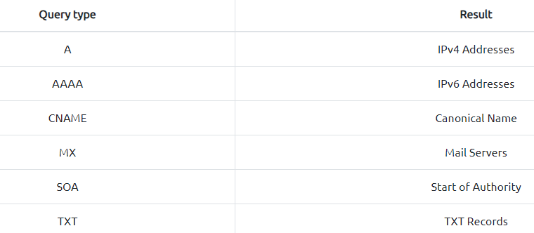 - OPTIONS contains the query type as shown in the table below. For instance, you can use A for IPv4 addresses and AAAA for IPv6 addresses.