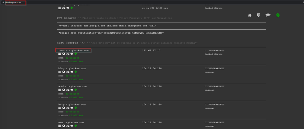 To avoid such a time-consuming search, one can use an online service that offers detailed answers to DNS queries, such as DNSDumpster. If we search DNSDumpster for tryhackme.com, we will discover the subdomain blog.tryhackme.com, which a typical DNS query cannot provide. In addition, DNSDumpster will return the collected DNS information in easy-to-read tables and a graph. DNSDumpster will also provide any collected information about listening servers.
