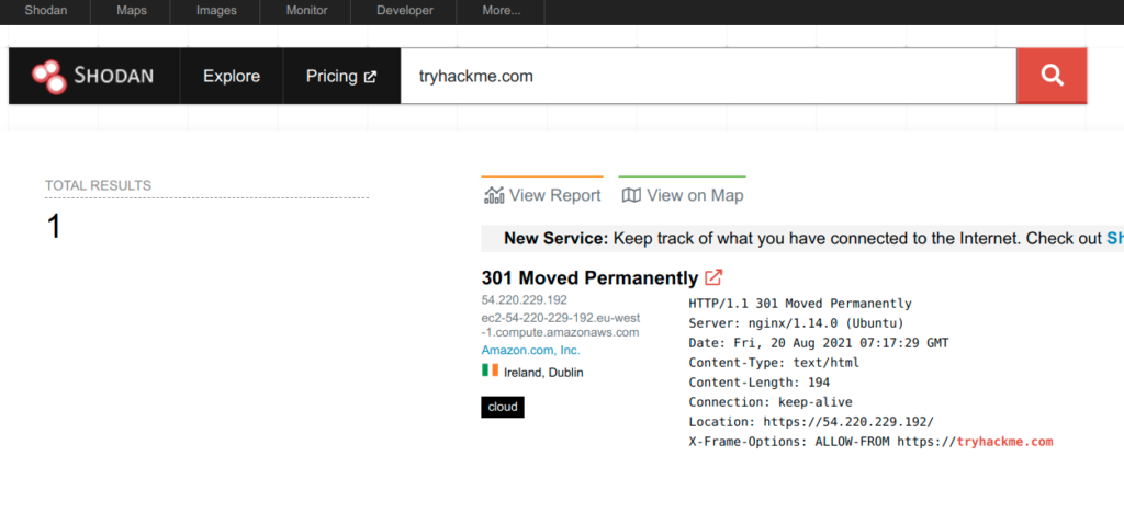 This record shows a web server; however, as mentioned already, Shodan.io collects information related to any device it can find connected online. Searching for tryhackme.com on Shodan.io will display at least the record shown in the screenshot above. Via this Shodan.io search result, we can learn several things related to our search, such as: