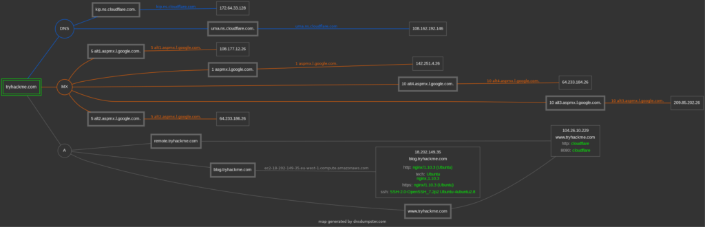 We will search for tryhackme.com on DNSDumpster to give you a glimpse of the expected output. Among the results, we got a list of DNS servers for the domain we are looking up. DNSDumpster also resolved the domain names to IP addresses and even tried to locate them. We can also see the MX records; DNSDumpster resolved all five mail exchange servers to their respective IP addresses and provided more information about the owner and location. Finally, we can see TXT records. Practically a single query was enough to retrieve all this information.