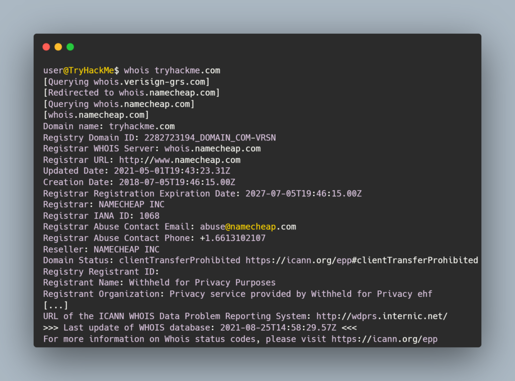 The syntax is whois DOMAIN_NAME, where DOMAIN_NAME is the domain about which you are trying to get more information. Consider the following example executing whois tryhackme.com.