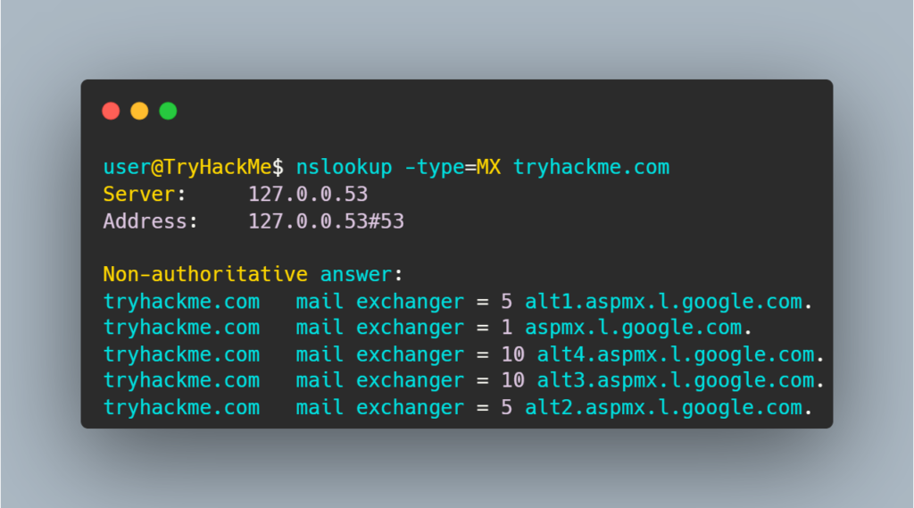 Let’s say you want to learn about the email servers and configurations for a particular domain. You can issue nslookup -type=MX tryhackme.com. Here is an example: