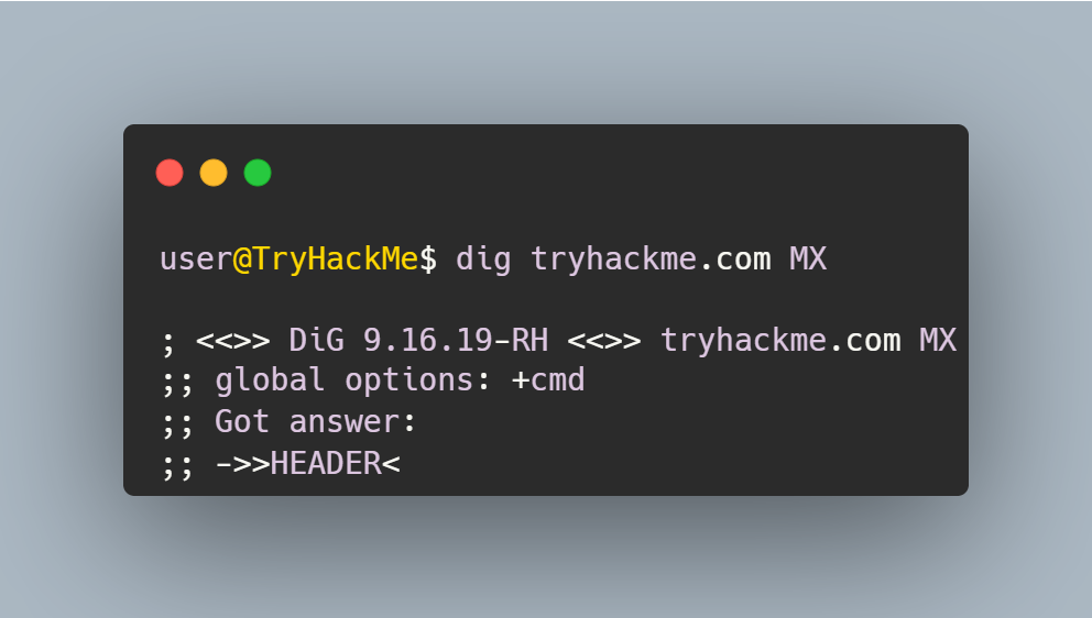 A quick comparison between the output of nslookup and dig shows that dig returned more information, such as the TTL (Time To Live) by default. If you want to query a 1.1.1.1 DNS server, you can execute dig @1.1.1.1 tryhackme.com MX.