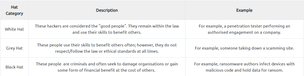 Hackers are sorted into three hats, where their ethics and motivations behind their actions determine what hat category they are placed into. Let’s cover these three in the table below:
