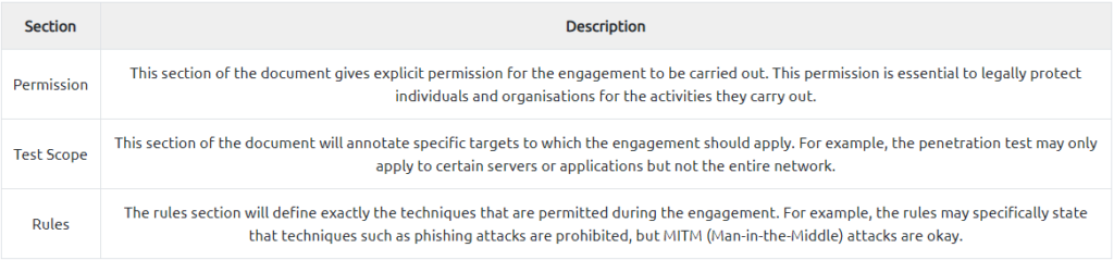 The ROE is a document that is created at the initial stages of a penetration testing engagement. This document consists of three main sections (explained in the table below), which are ultimately responsible for deciding how the engagement is carried out. The SANS institute has a great example of this document which you can view online here.