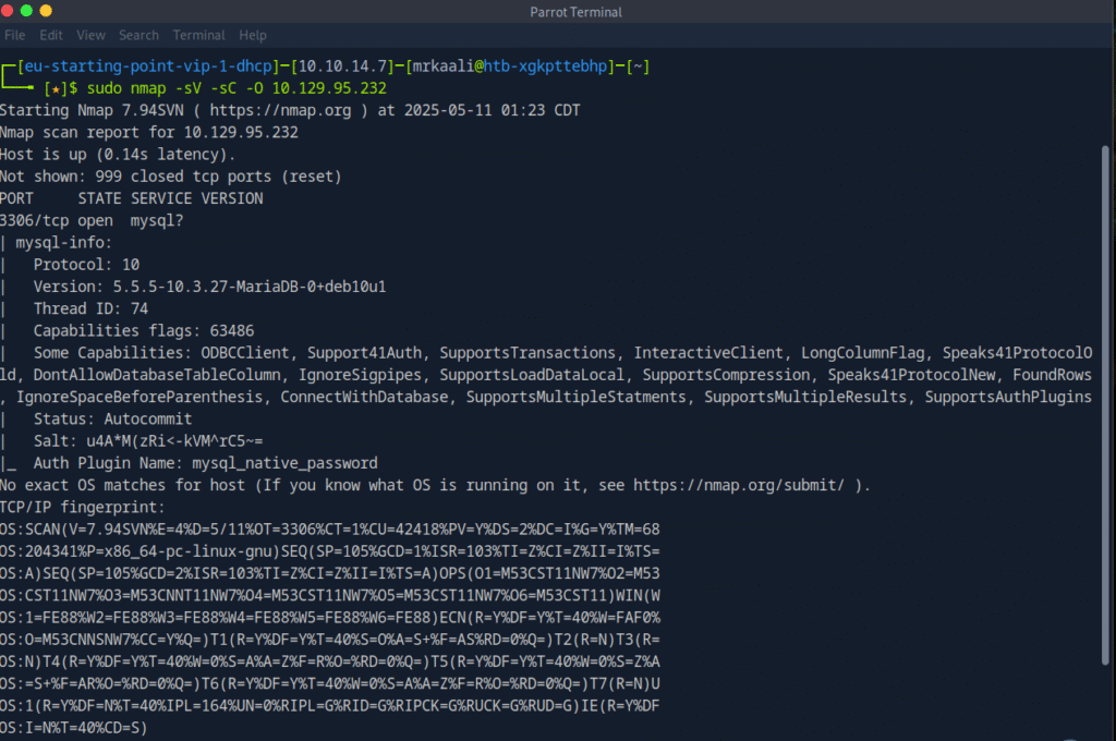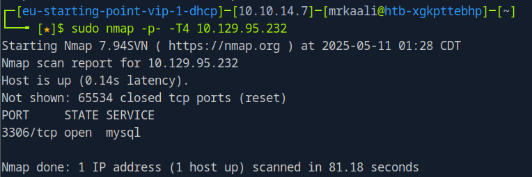 The above output shows that Port 3306is open, and mysql service is running on that port.