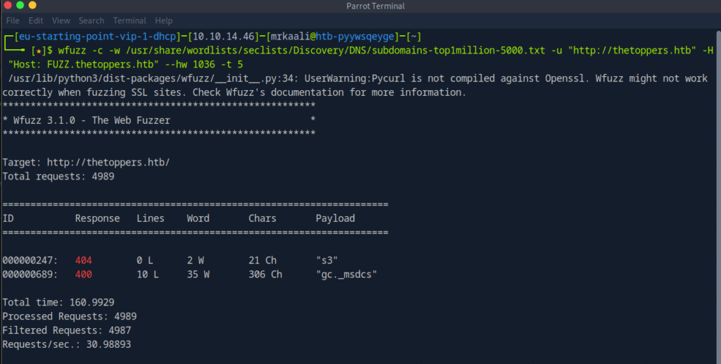 This wfuzz command is performing subdomain enumeration against thetoppers.htb by fuzzing the Host header with values from the provided wordlist. The -hw 1036 option filters out responses with 1036 words (likely the size of the default/error page), and -t 5 sets the number of concurrent threads to 5.