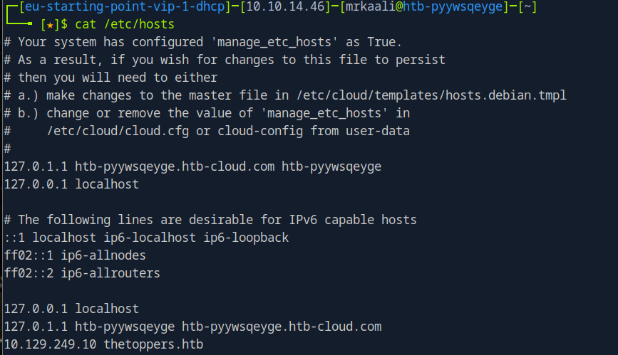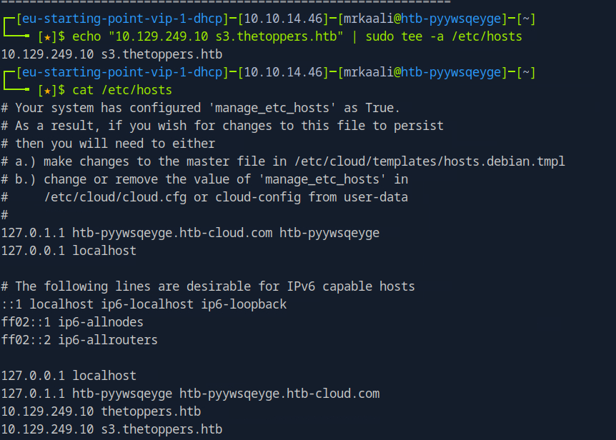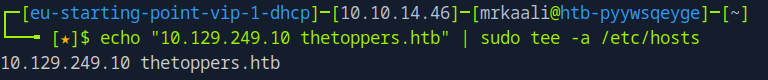 echo “10.129.249.10 thetoppers.htb” | sudo tee -a /etc/hosts : This command adds the line 10.129.249.10 thetoppers.htb to your /etc/hosts file, mapping the domain thetoppers.htb to the IP address 10.129.249.10 locally. This lets you access thetoppers.htb in your browser or tools, and have it resolve to 10.129.249.10.
