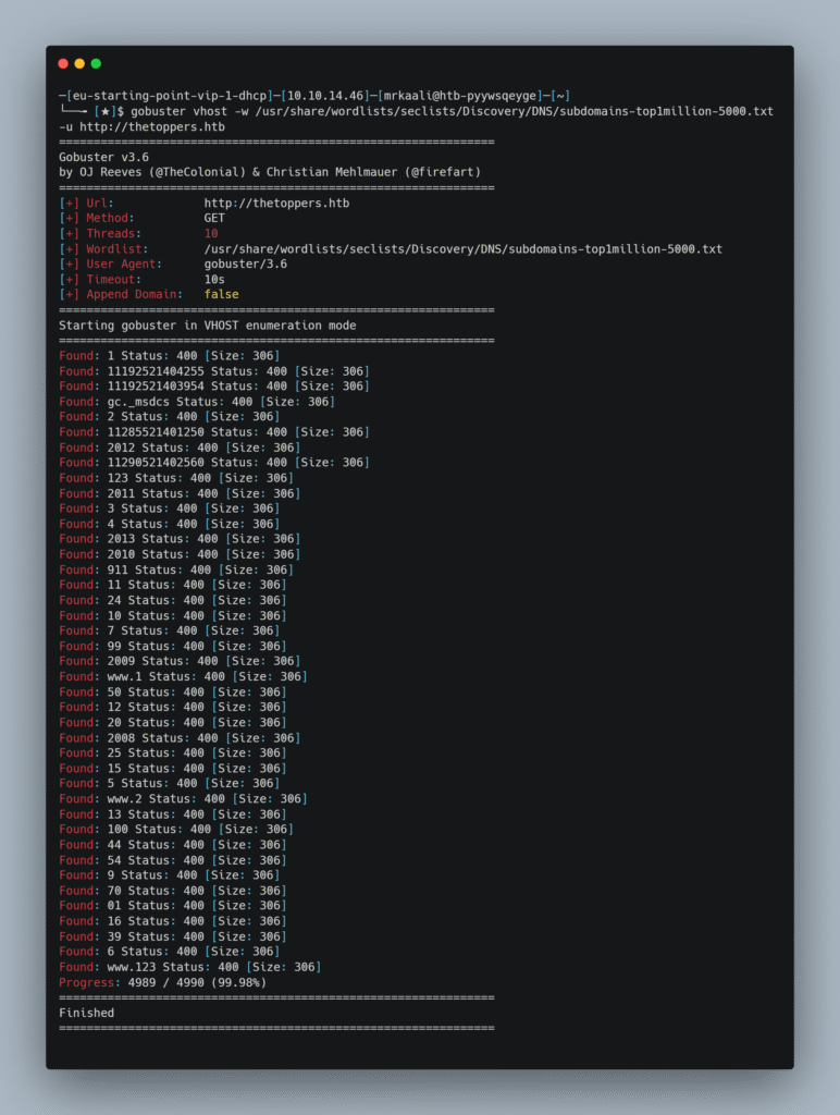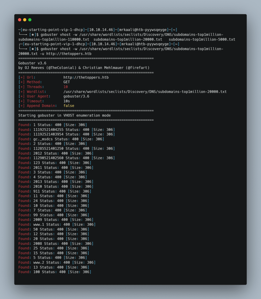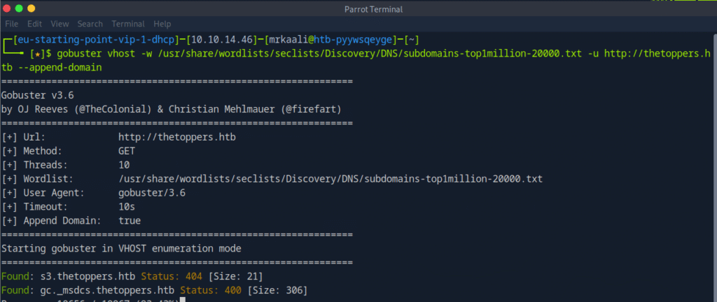 gobuster vhost -w /usr/share/wordlists/seclists/Discovery/DNS/subdomains-top1million-20000.txt -u http://thetoppers.htb –append-domain