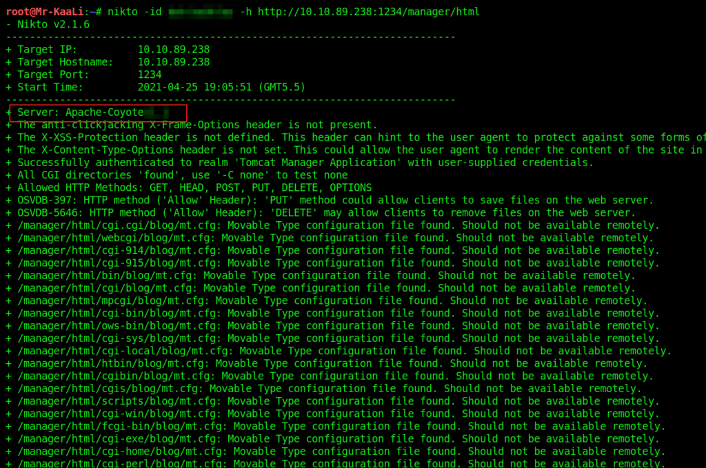 - 10. Use Nikto with the credentials you have found and scan the /manager/html directory on the port found above. How many documentation files did Nikto identify?